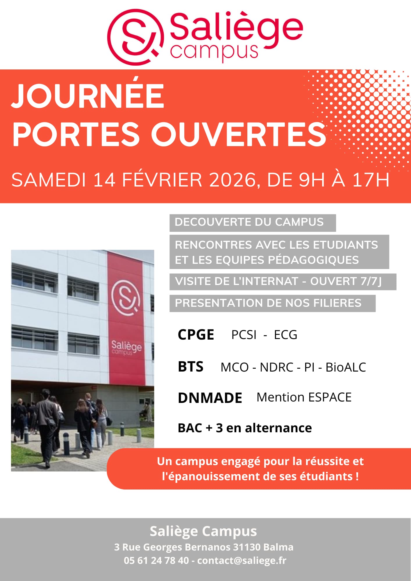 Depuis près de 30 ans, Saliège forme des étudiants en CPGE scientifiques et commerciales, en BTS tertiaires et production et en DNMADE. Nous accueillons 7 jours sur 7, plus de 75 % de nos étudiants de CPGE en internat.